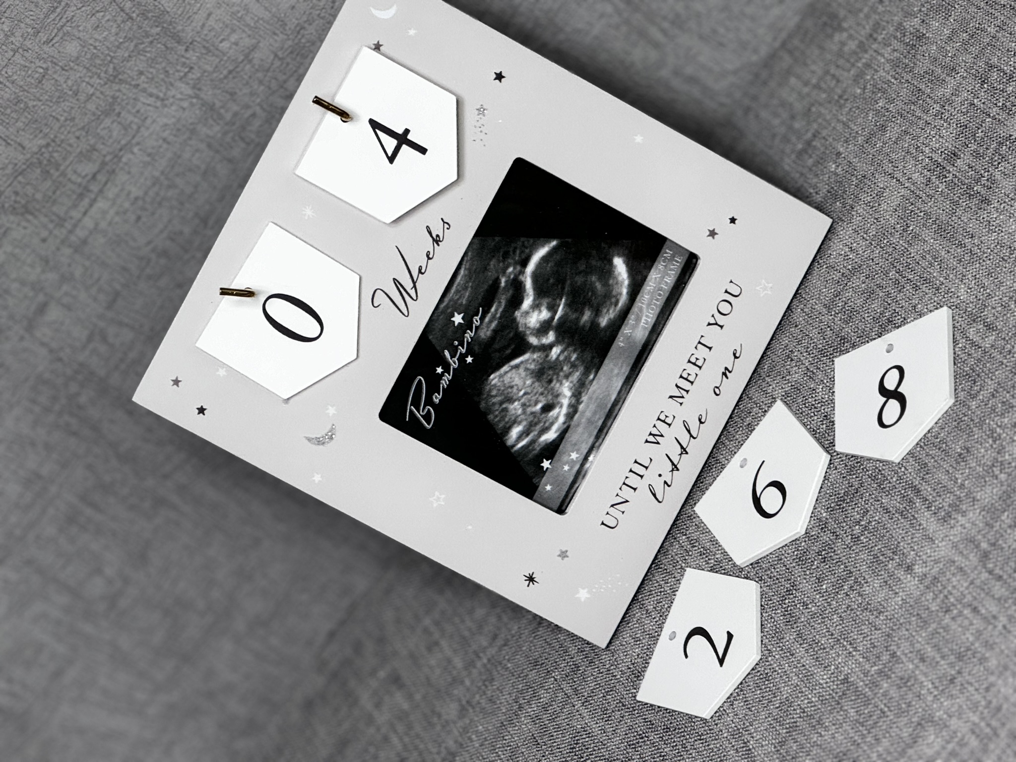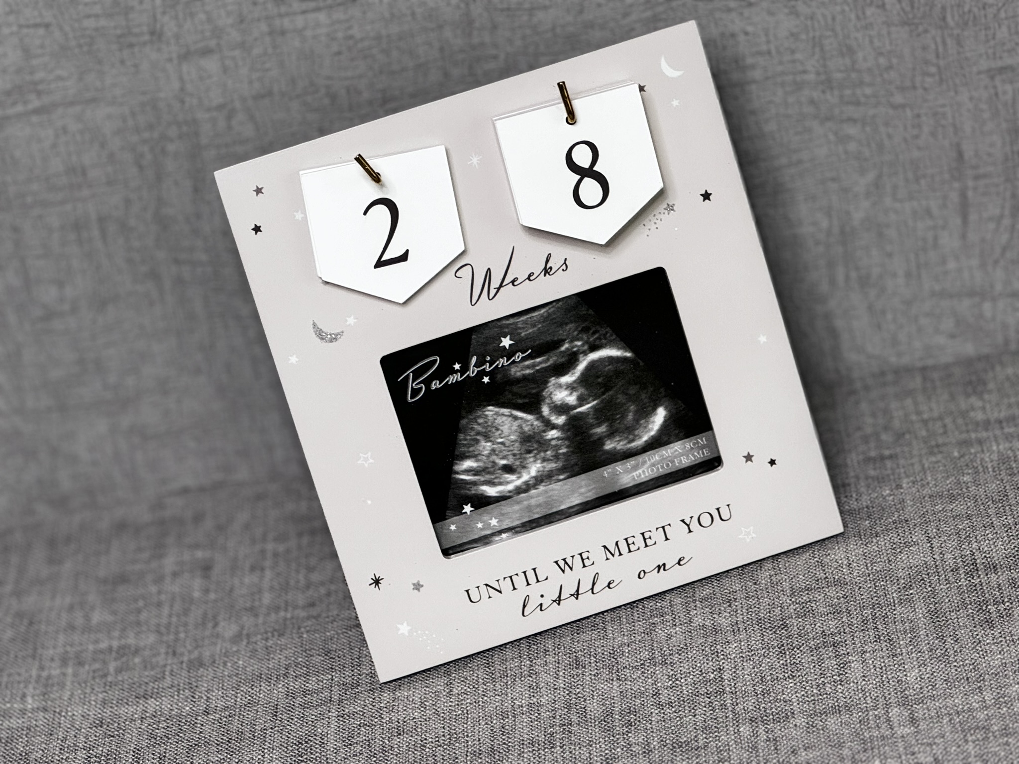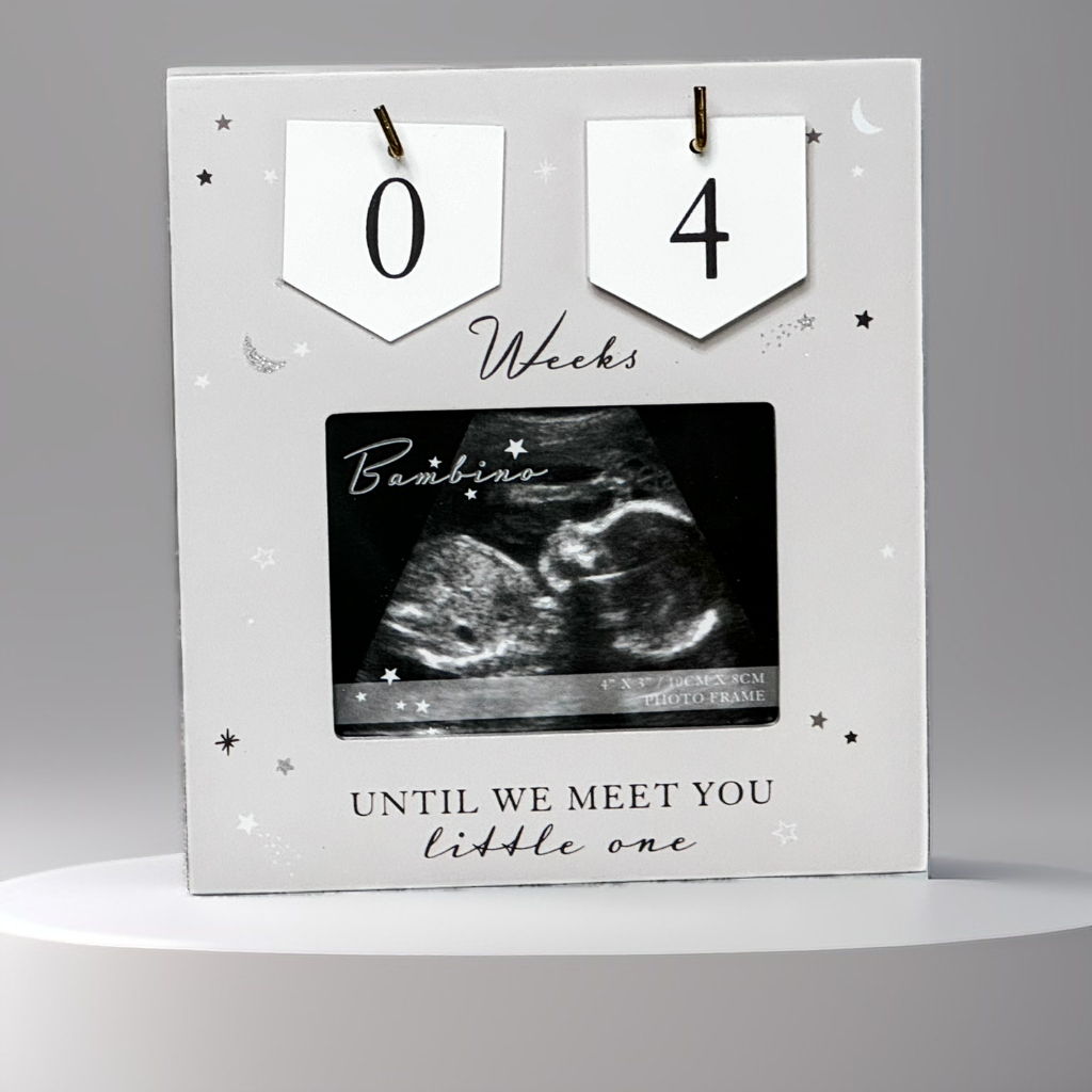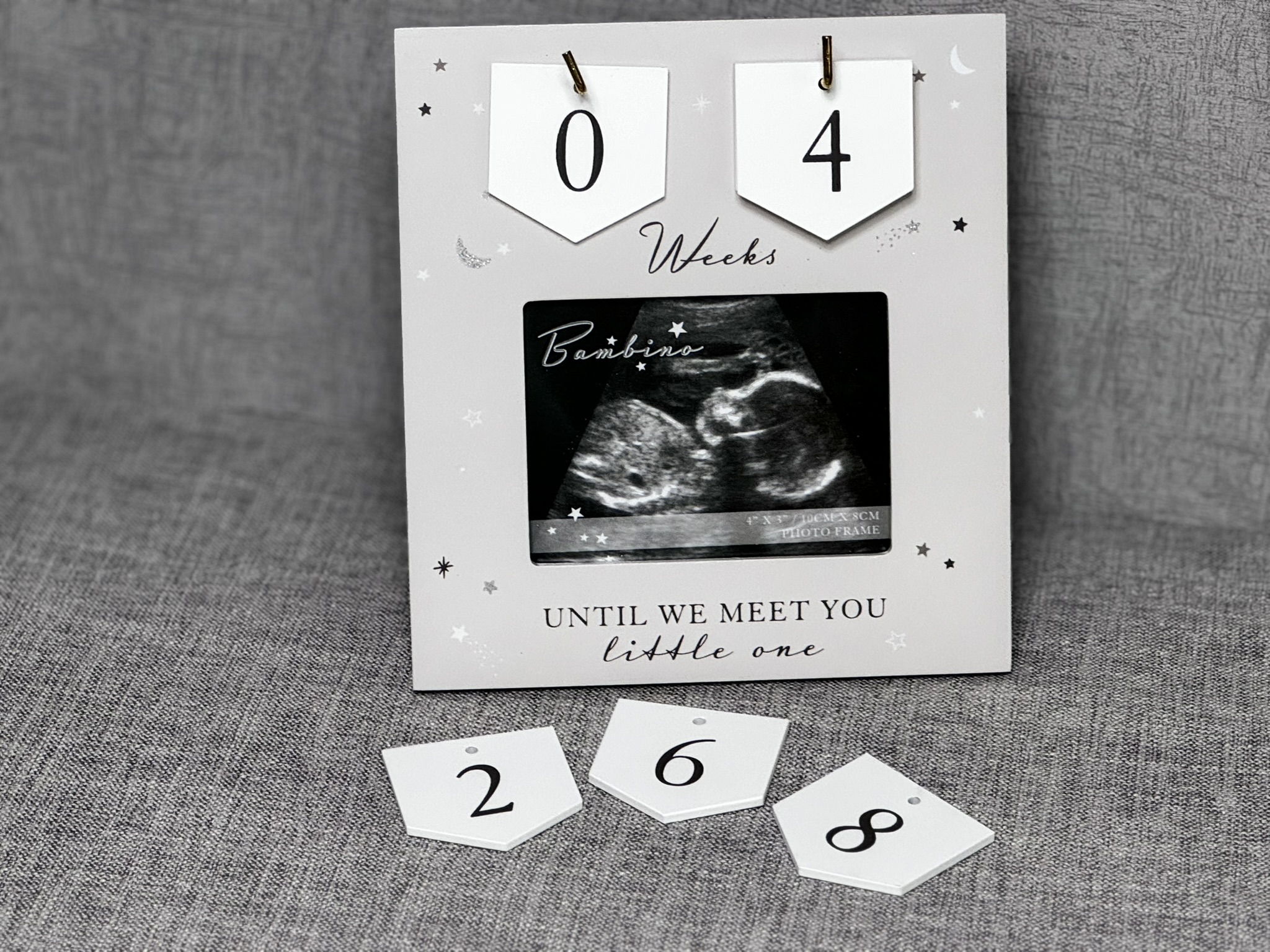 This gorgeous frame gives parents-to-be an adorable means of counting down the days. The wooden frame features a grey finish, enhanced by star decoration, ‘Weeks Until We Meet You Little One’ decal and rectangular aperture designed specifically for baby scan photos. It is completed by two hooks above the aperture, on which to hang the numbers included for weekly countdown towards the baby’s due date.